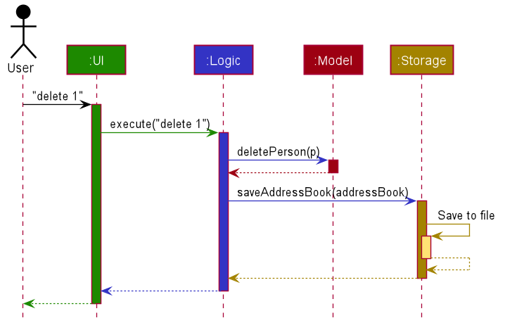 The Sequence Diagram below shows how the components interact with each other for the scenario where the user issues the command delete 1.