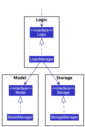 For example, the Logic component defines its API in the Logic.java interface and implements its functionality using the LogicManager.java class which follows the Logic interface. Other components interact with a given component through its interface rather than the concrete class (reason: to prevent outside component’s being coupled to the implementation of a component), as illustrated in the (partial) class diagram below.