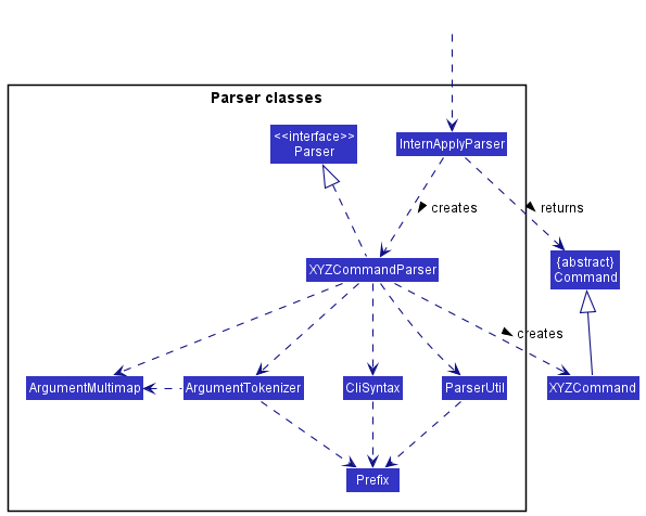 XYZCommandParserclasses (e.g.,AddCommandParser,DeleteCommandParser, …) inherit from theParserinterface so that they can be treated similarly where possible e.g, during testing.